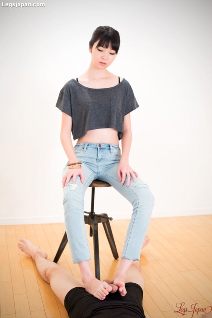 Sitting on stool wearing jeans hands on her thighs hard cock between her bare feet
