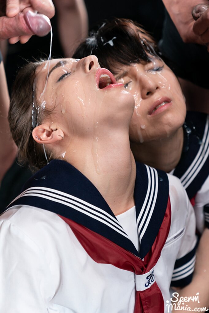 Kogals on their knees in uniform receiving bukkake facials